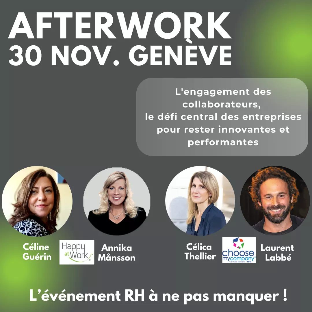 L'engagement et la satisfaction des employés ne sont pas seulement importants pour la santé mentale sur le lieu de travail, mais peuvent aussi faire la différence dans les résultats d'une entreprise. Nous sommes très heureux de nous associer à ChooseMyCompany pour un afterwork à Genève le 30 novembre à 17h30. Au programme : Exploration approfondie de l'engagement des collaborateurs, le défi central des entreprises innovantes et performantes. Décryptage des stratégies essentielles pour cultiver l'engagement et favoriser une culture d'entreprise forte et durable. Rejoignez-nous le 30 novembre pour fédérer les énergies et l'engagement au travail ! Inscription obligatoire.