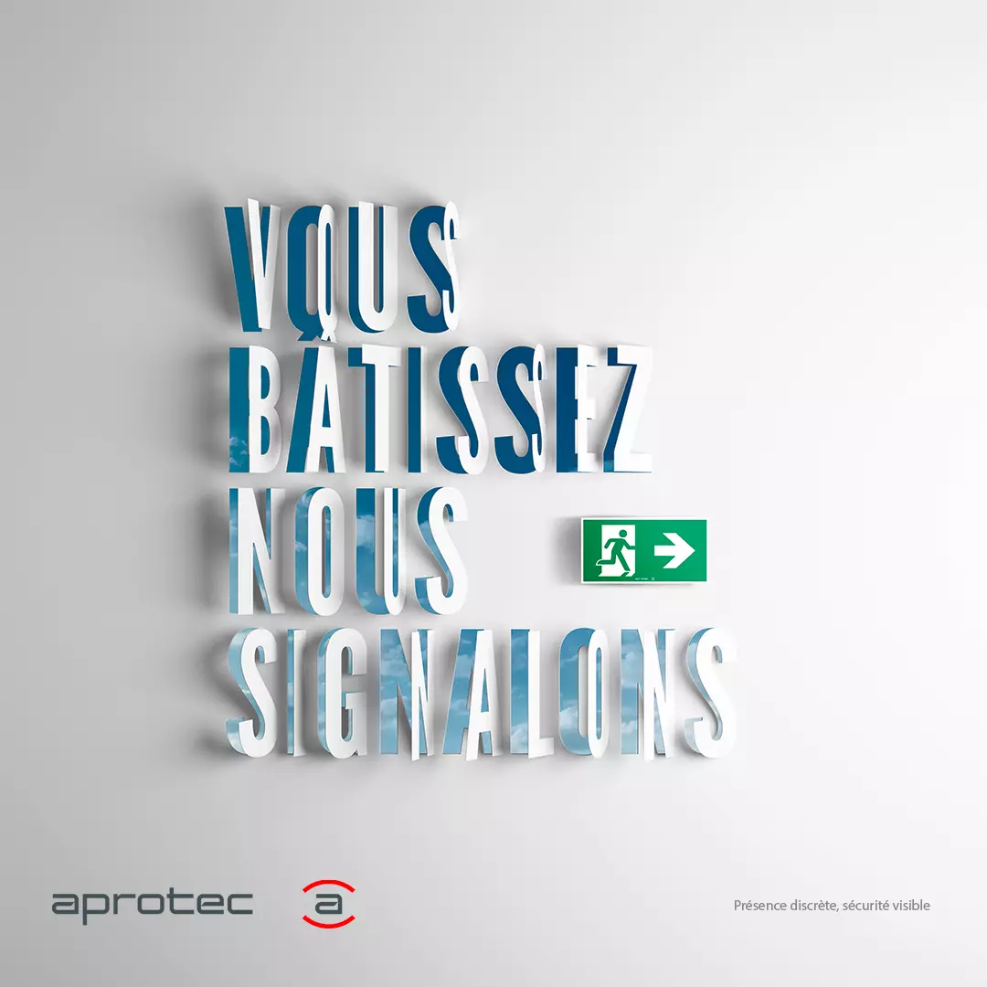 En mettant en valeur la compétence de ses mandants et en s’associant à leurs efforts, Aprotec rappelle la force et l’évidence du partenariat. « Vous bâtissez. Nous signalons ». L’accroche, composée de lettres découpées et entrouvertes comme autant d’issues de sorties, est réalisée en 3D dans un langage d’une simplicité parfaitement rassurante. La blancheur et le ciel bleu sont en effet les fondamentaux symboliques du « sans-souci ».