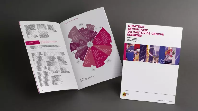 Après la stratégie économique du Canton, le DSE a sollicité colegram pour sa stratégie sécuritaire. Plus que jamais au cœur de l’actualité, la sécurité est de fait un enjeu majeur de gouvernance. C’est donc avec toute la minutie requise que l’agence a abordé le design de cette brochure.
