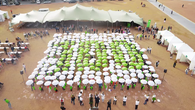 La foule a notamment été conviée à participer à un grand « happening » participatif. 320 personnes se sont vu offrir des parapluies aux couleurs de l’Association et, d’après un scénario individualisé parfaitement ficelé, ont pu dessiner des symboles en les actionnant alternativement.