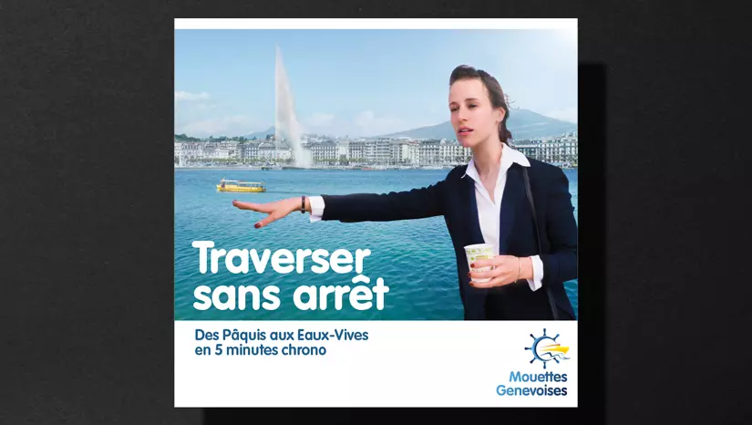 C’est de ce postulat très pragmatique que colegram est partie pour les sujets de sa nouvelle campagne. «Traverser sans détours », «Traverser sans arrêt »; on est bien loin de la triste expérience des automobilistes genevois cherchant à rallier l’autre rive. Les business people qui figurent sur les affiches rappellent que les petits bateaux jaunes, bien plus qu’une occasion de se promener sur la rade, sont un moyen de transport efficace avec lequel il leur serait très profitable de composer davantage dans leurs déplacements quotidiens.